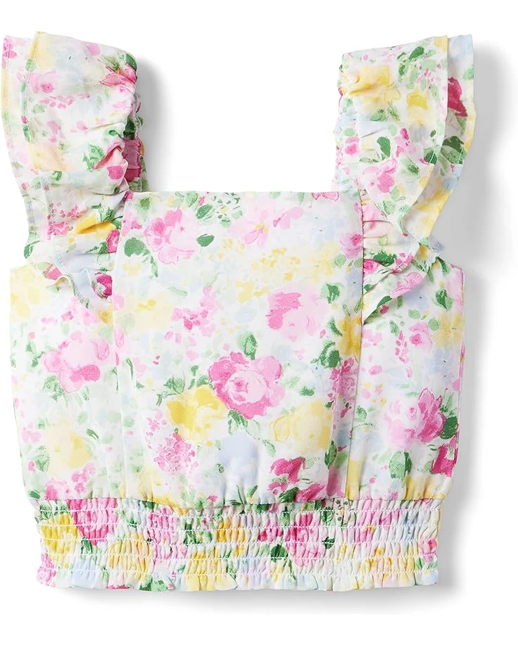 Janie and Jack Kids’ Apparel SKU: #9875088Your younger one will look charming and celebrate all-day comfort even during the warmer days of the year by wearing the Janie and Jack® Multi Floral Top.Chiffon fabric with allover colorful floral print.Sleeveless design with tiered ruffle straps.Square neckline.Buttoned back closure.Stretch smocked hem.Cropped silhouette.100% polyester.Machine washable.Style Number: 100045824.Imported.