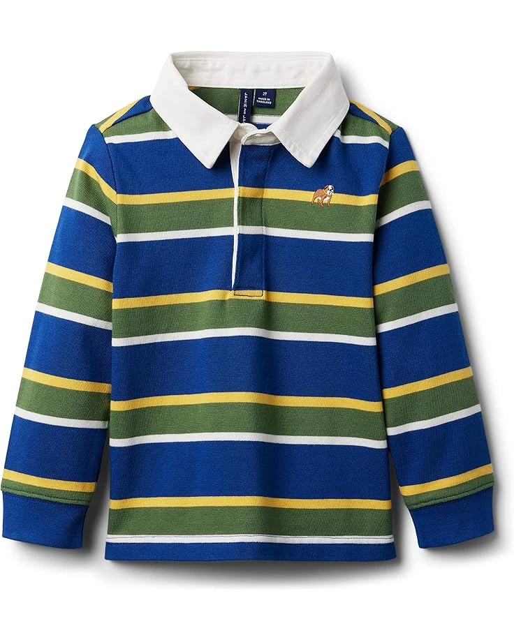 Janie and Jack Kids’ Apparel SKU: #9805989A modern take on the classic design, the Janie and Jack® Striped Rugby Shirt is a smart choice to amp up your kids’ style quotient. Allover stripes pattern. Contrasting spread collar and long sleeves with ribbed cuffs. Center-front half-button placket. Embroidered icon on the upper left chest featuring a bulldog.Straight hemline. 100% cotton.Machine washable. Imported. Style No: 100043346.