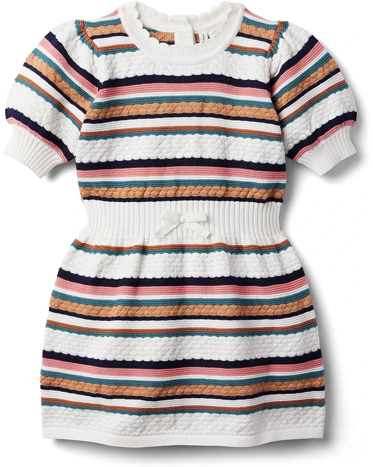 Janie and Jack Kids’ Apparel SKU: #9805954Boasting a striking medley of colorful, textured stripes all over, the Janie and Jack® Striped Sweaterdress is destined to become your junior’s favorite this fall.Fit-and-flare silhouette.Scalloped neckline and puffed short sleeves.Elasticized waist with an adorable bow-tie accent.Buttoned back closure.Above-the-knee length hem.59% cotton, 41% polyester.Machine washable.Imported.